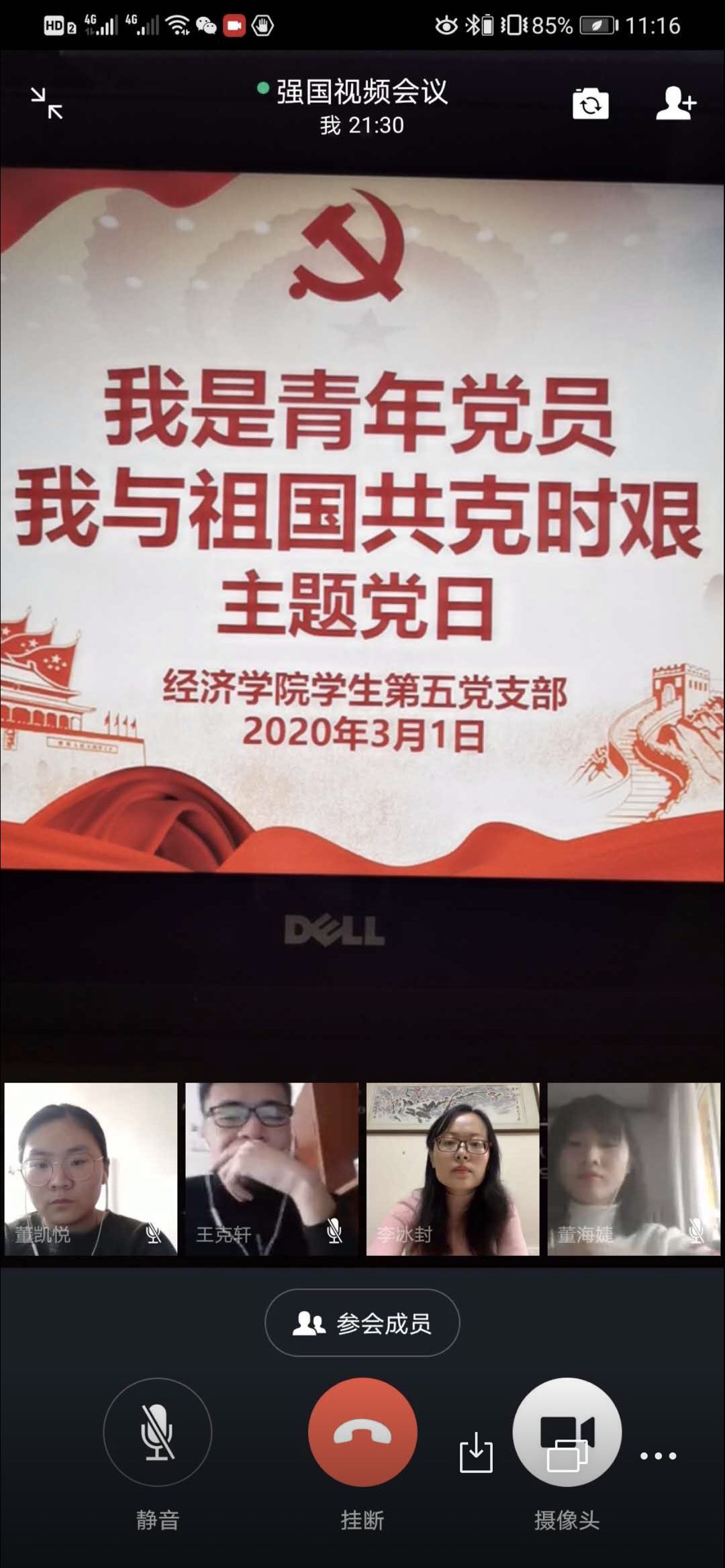 视频会议上,各党支部书记首先向奋战在教学准备一线的教工党员和严守在家的学生党员们致以问候,向全体党员介绍了学校疫情防控工作的各项举措,要求全体党员要认真学习党中央和学校有关新冠肺炎疫情防控期间的有关文件和通知,落实党中央和学校疫情防控部署,坚决打赢疫情防控阻击战。接着,支部书记带领大家学习了习近平总书记在统筹推进新冠肺炎疫情防控和经济社会发展工作部署会议上的重要讲话。每位党员结合讲话精神在线上展开了热烈的讨论和发言。“我是青年党员,我与祖国共克时艰”、“抗击疫情,从我做起”、“践行初心战疫情,共克时艰勇担当”、“凝心聚力战疫情,共克时艰显担当”、“克明峻德众志成城,青年党员共抗疫情”、“战疫情、学英模”、“共抗疫情,共同行动,勇当先锋”、“抗击疫情齐聚力,共克时艰守初心”、“践初心勇担当,强信心战疫情”、“‘疫’线承诺唤初心,共克时艰担使命”、“疫情防控期间做好本质工作”,12个教工和学生党支部用不同的主题唱出了党员同志们共同抗击疫情的强烈呼声,不仅道出了对抗疫一线英雄们的关爱和祝福,也展示了师生党员强烈的责任感和使命感。最后各支部书记传达中央和学校号召,倡议全体党员积极行动起来,自愿捐款同心抗疫。全体党员通过网络表达了对一线抗疫英雄的祝福,并以实际行动积极响应党的号召踊跃捐款,传递实实在在的温暖,为抗击疫情奉献自己的绵薄之力。经济学院党委共计自愿捐�17558元�