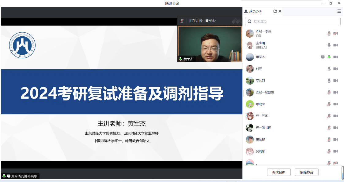 为进一步推�2024届毕业生就业工作,做好考研复试、调剂指导工作,2�21日上午,我院于线上召开2024届毕业生考研调剂指导暨就业答疑座谈会,此次座谈会面向大四毕业生,特邀山东财经大学校友、峰研教育创始人黄军杰为学生们作考研复试和调剂工作指导,院党委副书记李冰封出席会议,院团委书记付雯和辅导员秦小晴参加会议,并分别为毕业生讲解毕业前的注意事项以及就学生提出的就业相关问题答疑解惑,会议由秦小晴主持�